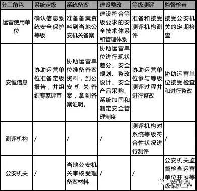 等級保護全生命周期各階段工作及分工情況如下表所示: