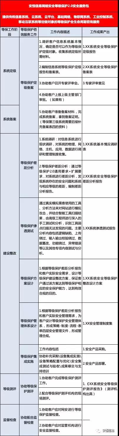 安恒等級保護咨詢服務(wù)由如下服務(wù)包組成,服務(wù)包可根據(jù)需求組合拆分: