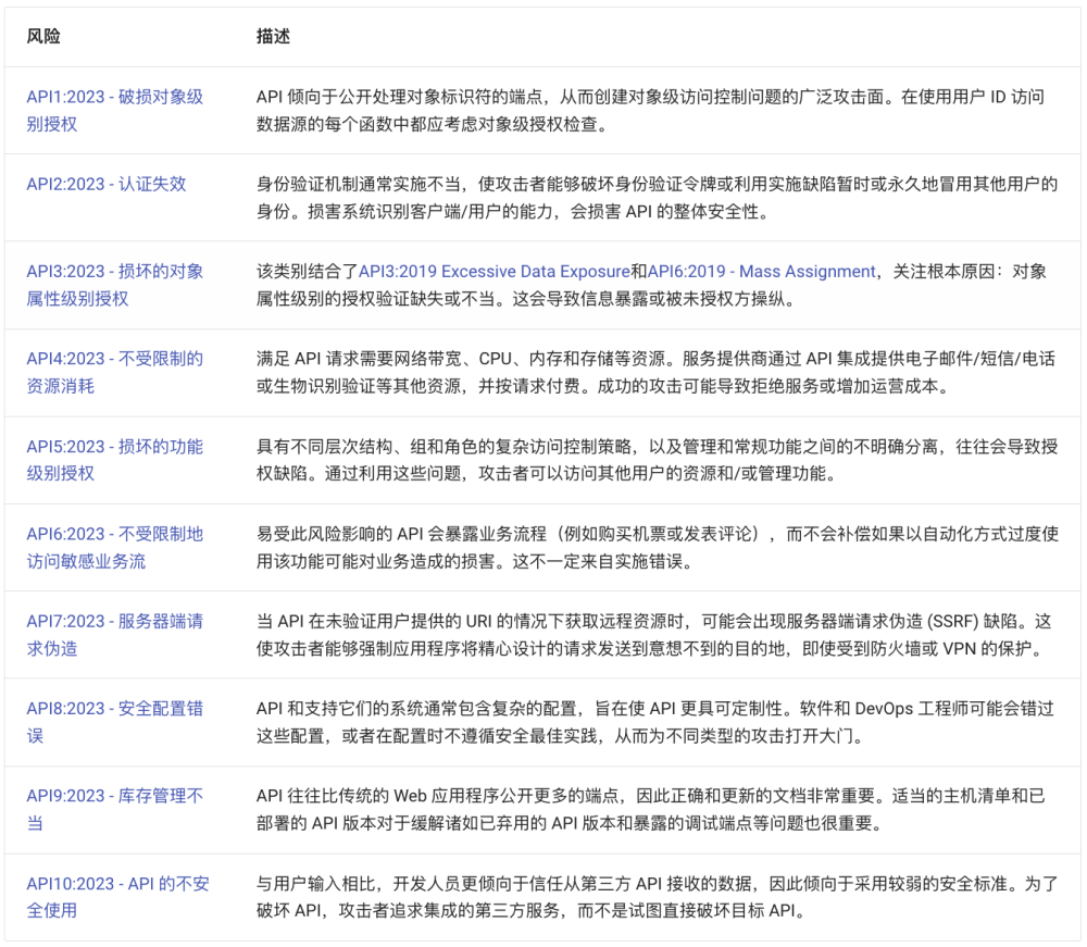 OWASP API Security是一項專注于API安全的研究項目,旨在喚醒公眾對API潛在風險的認識,提醒開發(fā)人員和安全人員加強對API安全的關注。從2019年首次發(fā)布API Security Top 10起,這份清單便以其獨特的視角,準確地揭示了API安全中的重要風險。隨后,2023年的更新版本是 OWASP API Security Top 10 的第二版,距首次發(fā)布正好四年。API(安全)領域發(fā)生了很多變化。API 流量快速增長讓API 安全獲得更多關注,涌現出許多新的 API 安全供應商/解決方案,當然,攻擊者已經開發(fā)出新的技能和技巧來破壞 API。以下是2023年發(fā)布的最新的風險清單: