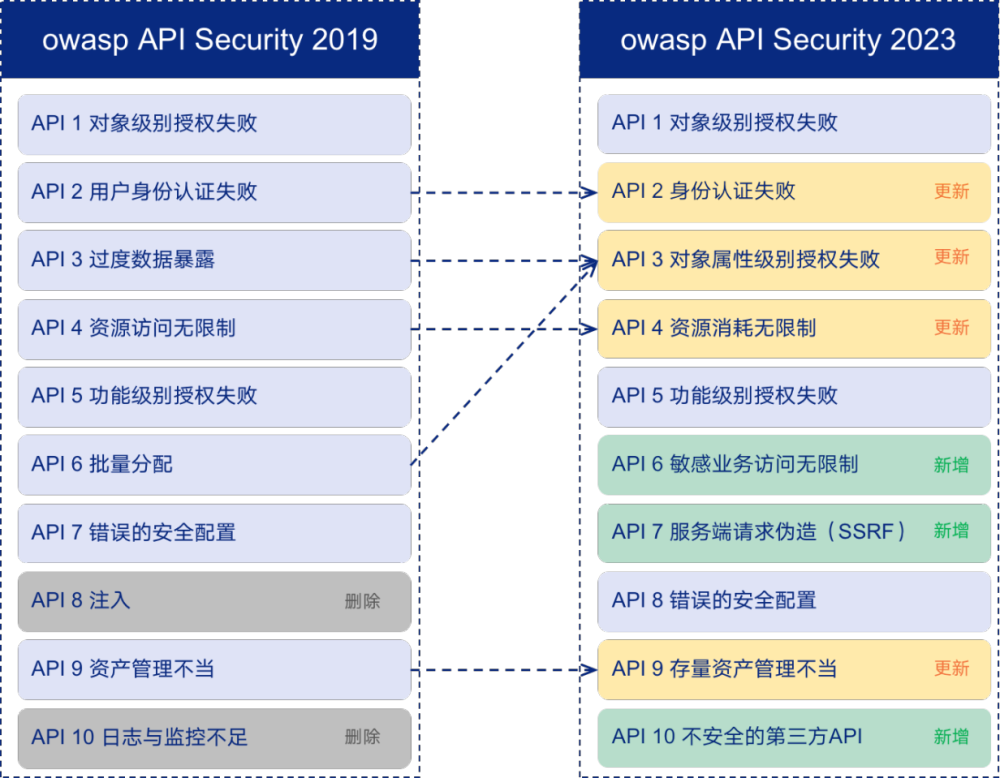 OWASP 2023 年和 2019 年十大 API 列表