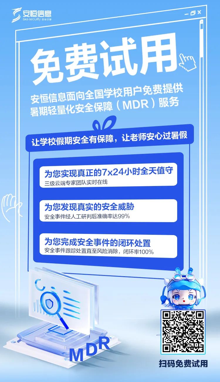 安恒信息面向廣大學(xué)校用戶推出暑假輕量化安全保障服務(wù),協(xié)助學(xué)校做好全天候網(wǎng)絡(luò)安全值守、保障工作。