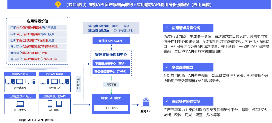 以0代碼改造設計交付用戶輕量級的Agent,將API業(yè)務請求流量轉(zhuǎn)發(fā)至零信任API網(wǎng)關,通過流量中攜帶的身份令牌,確保每一次請求都是被鑒權的,確保調(diào)用是安全可靠的,且可實現(xiàn)調(diào)用中的數(shù)據(jù)動態(tài)脫敏。通過高性能/高可用架構設計,配合零信任各個核心服務組件/容器設計了異常狀態(tài)發(fā)現(xiàn)、主動巡檢等功能,通過Bypass、主備故障切換等業(yè)務設計,保障了業(yè)務延續(xù)性。