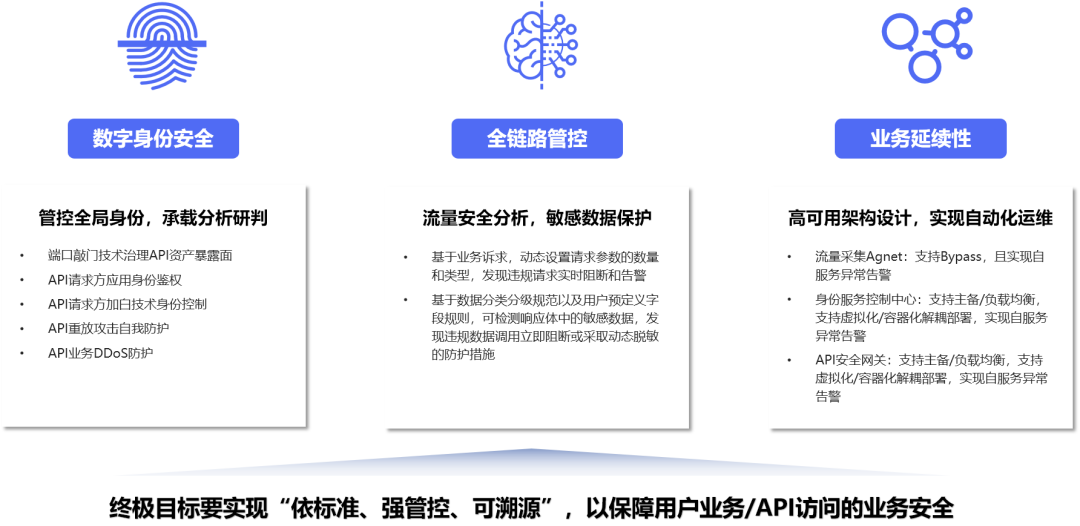 對API調(diào)用的應用身份進行識別以及權限的核查管控,確保身份/權限合一,根據(jù)隨請求上報的風險及歷史行為識別可疑操作;