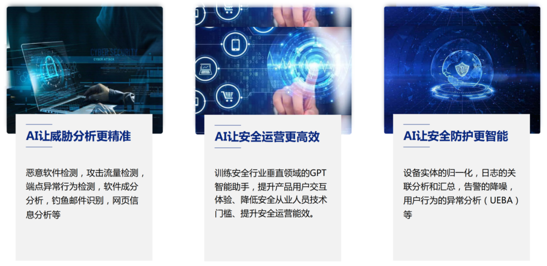 在保障人工智能安全的同時,安恒信息也在利用人工智能技術(shù)賦能安全,不斷實現(xiàn)產(chǎn)品智能化、自動化,加強(qiáng)AI智能數(shù)據(jù)分析、AI智能自動響應(yīng)、AI智能安全等前沿技術(shù)的融合。已經(jīng)將類大模型應(yīng)用于智能數(shù)據(jù)分類分級、智能生成檢測規(guī)則、智能告警處置分析、安全專家問答系統(tǒng)、智能釣魚郵件分析、智能加密流量檢測等數(shù)十個場景,推進(jìn)研究并逐步落地到產(chǎn)品中。