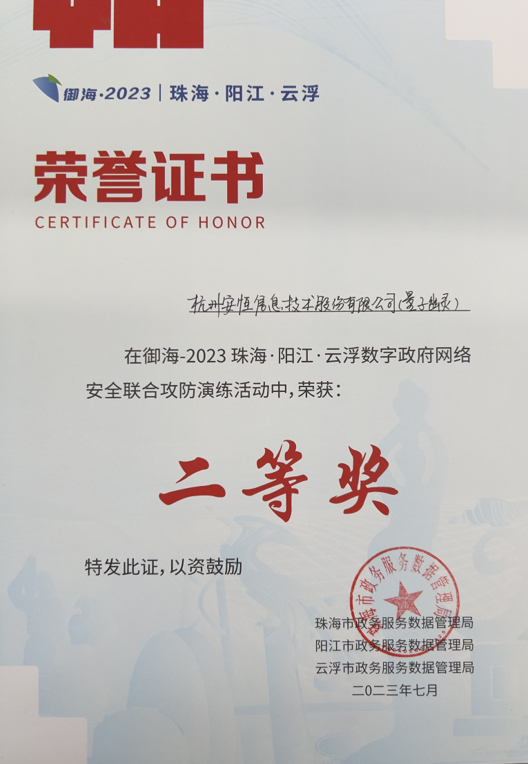 再添佳績!安恒信息榮獲御海2023聯(lián)合攻防演練二等獎!