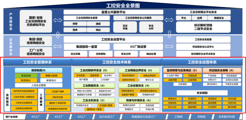 工控安全體系主要包括整體管理要求、項目安全管理、運營安全管理以及風險評估、威脅預警、應急處置相關流程,覆蓋工控系統(tǒng)從建設到運營使用全生命周期,形成管理規(guī)定、流程、規(guī)范等體系文件,根據(jù)企業(yè)的數(shù)字化建設程度,制定具有針對性的工控安全體系。