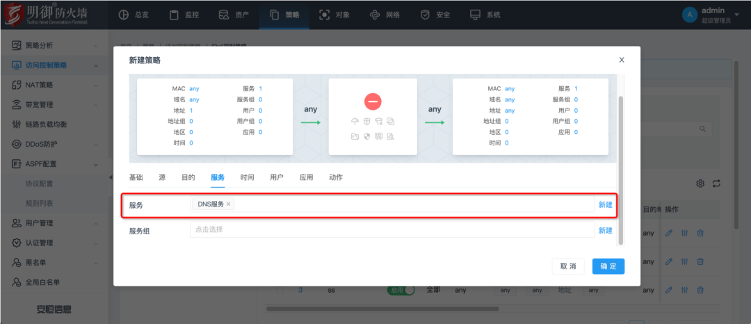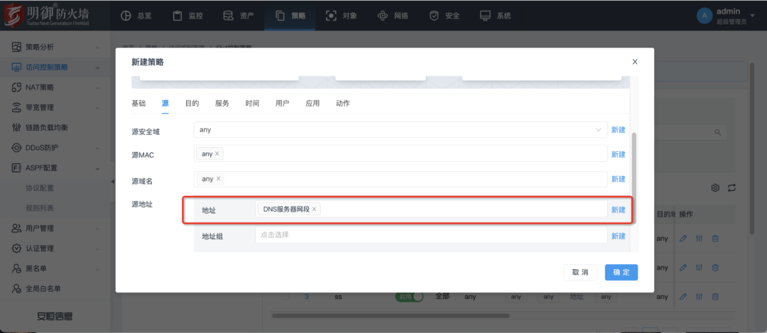 2.配置訪問(wèn)控制策略:禁止來(lái)源于外網(wǎng),源IP為DNS服務(wù)器同網(wǎng)段IP的DNS請(qǐng)求(適用于DNS服務(wù)器需要對(duì)外開(kāi)啟)。
