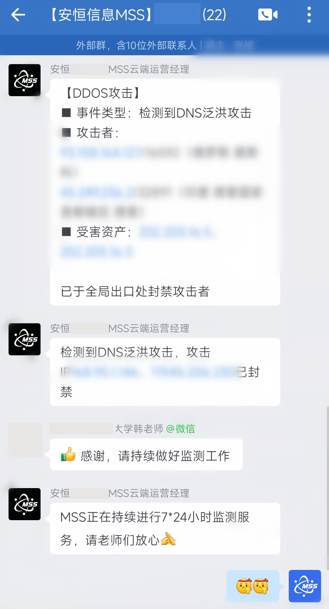 針對(duì)正在使用安全托管運(yùn)營(yíng)服務(wù)MSS的用戶(hù),MSS安全運(yùn)營(yíng)團(tuán)隊(duì)將根據(jù)單位流量情況與設(shè)備負(fù)載狀況為您定制化調(diào)優(yōu)DDoS攻擊檢測(cè)模型,并持續(xù)進(jìn)行7*24威脅監(jiān)測(cè)分析,MSS將在監(jiān)測(cè)到真實(shí)攻擊后第一時(shí)間通知給安全負(fù)責(zé)人,并協(xié)助完成事件處理。