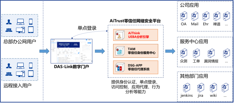 安恒信息首先以自己為樣板,詮釋了零信任方案的落地。通過(guò)上線自研的零信任方案,對(duì)外提供了以零信任溝通的統(tǒng)一訪問(wèn)入口,通過(guò)終端安全技術(shù),實(shí)現(xiàn)了賬號(hào)、設(shè)備、行為一體化的信任評(píng)估能力,結(jié)合零信任的特點(diǎn)“先認(rèn)證后連接”,保證了公司面向互聯(lián)網(wǎng)的業(yè)務(wù)系統(tǒng)和數(shù)據(jù)資產(chǎn)安全隱身,并通過(guò)動(dòng)態(tài)權(quán)限控制、數(shù)據(jù)保護(hù)策略保證了多樣化終端遠(yuǎn)程接入后的安全保障能力。