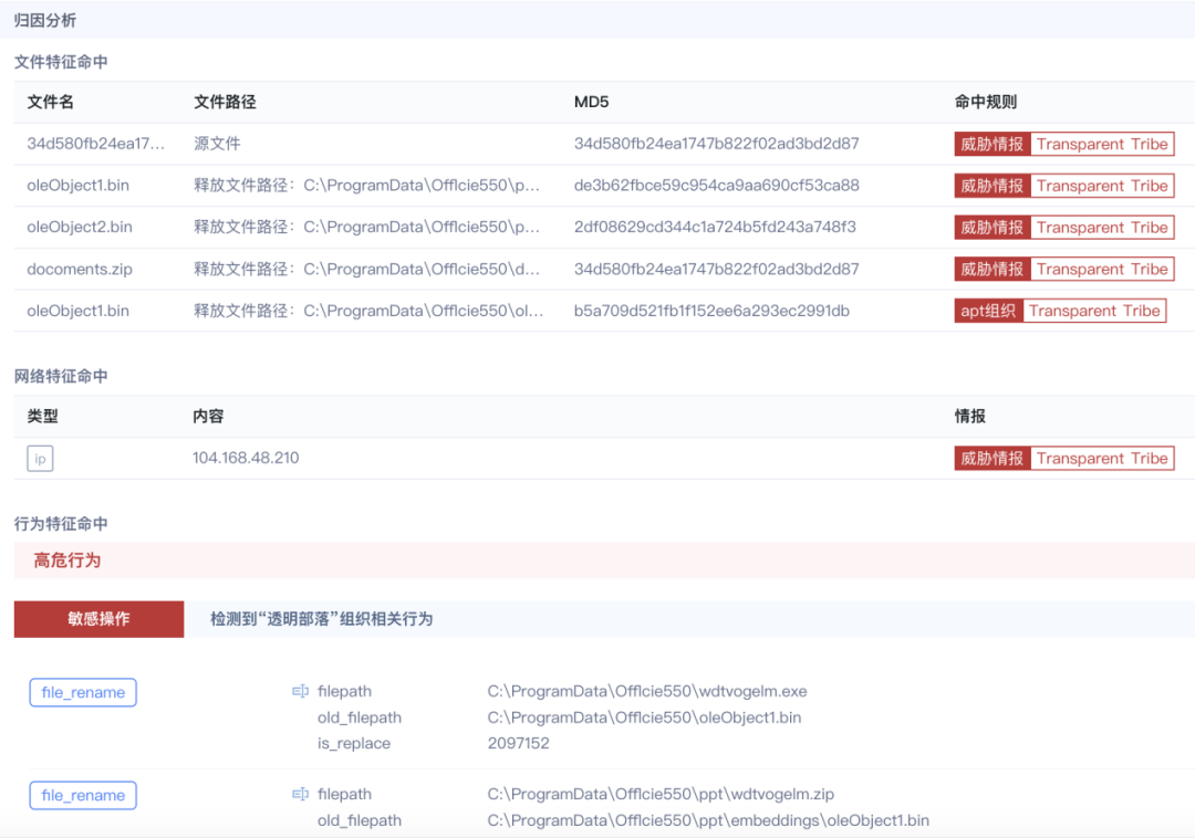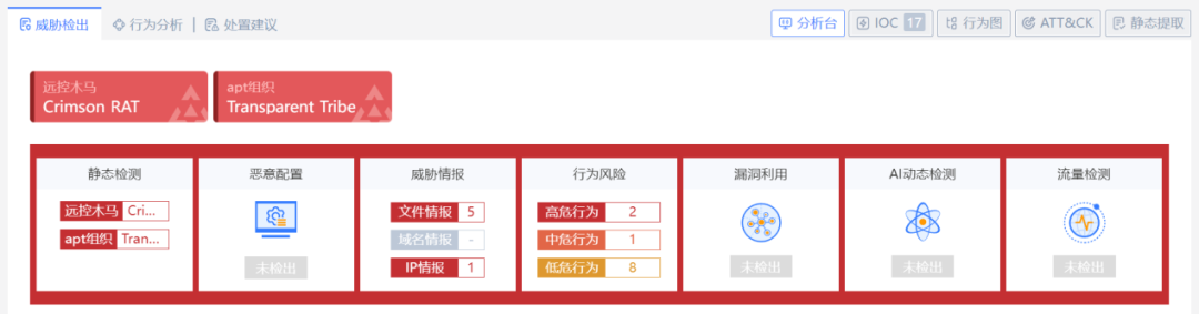 以透明部落組織的一個樣本為例,經(jīng)過安恒云沙箱綜合分析,快速獲得樣本的詳細分析信息,從聚合標簽中即可判斷出樣本為Crimson RAT,APT組織為Transparent Tribe(透明部落)。