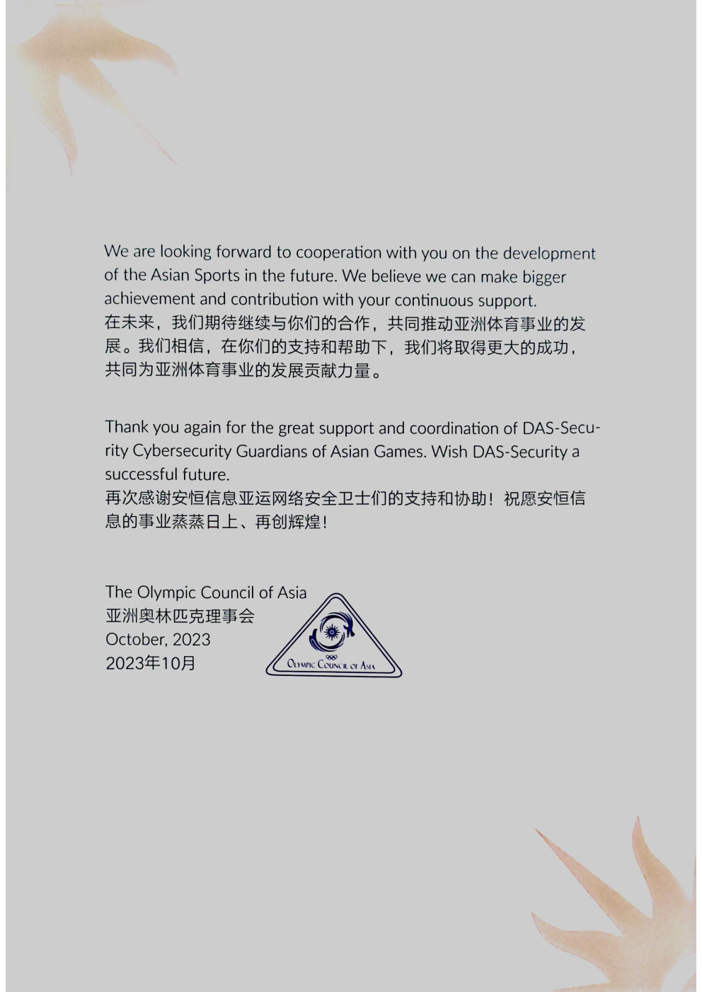 為亞洲體育事業(yè)貢獻(xiàn)力量!安恒信息收獲亞奧理事會(huì)感謝信