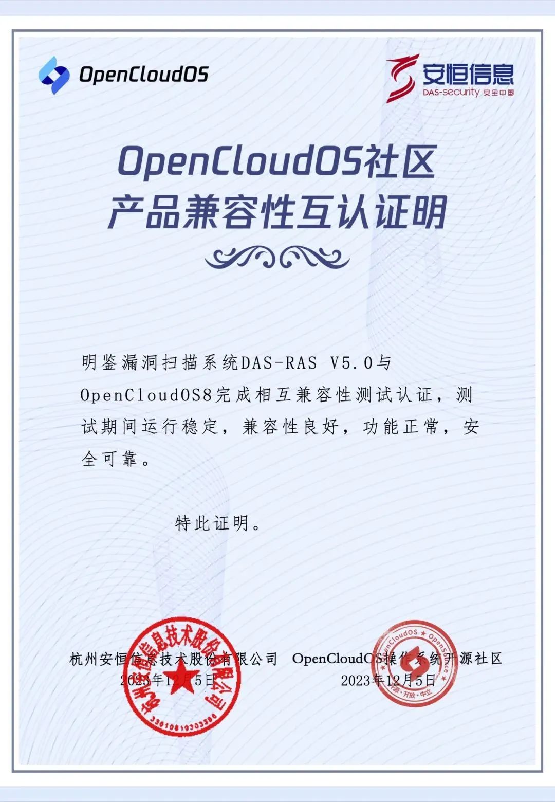 安恒信息加入 OpenCloudOS 社區(qū),完成技術(shù)兼容互認證