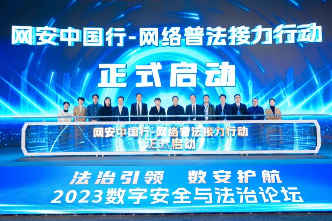 論壇現(xiàn)場,中央網(wǎng)信辦法治局、中國網(wǎng)絡(luò)安全協(xié)會、浙江省委網(wǎng)信辦、杭州市委宣傳部、杭州市余杭區(qū)政府與安恒信息等9家首批接力單位共同啟動了“網(wǎng)安中國行——網(wǎng)絡(luò)普法接力行動”。