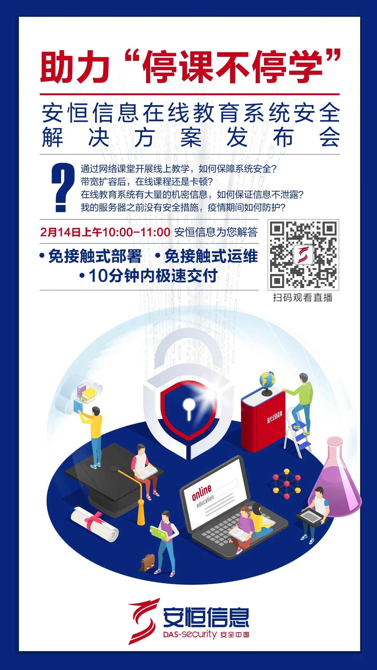 安恒信息基于教育機構(gòu)的網(wǎng)絡(luò)特性和行業(yè)沉淀,推出一體化的在線教育系統(tǒng)安全解決方案。由于疫情特殊時期,免接觸、交付快、響應(yīng)快的saas化安全解決方案成為當(dāng)前的不二選擇。