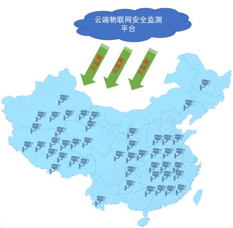 針對本地區(qū)資產(chǎn)情況與風(fēng)險情況,鑒于當(dāng)前疫情時期,可以優(yōu)先采用安恒信息云端物聯(lián)網(wǎng)安全監(jiān)測平臺進(jìn)行安全檢查,徹底理清轄區(qū)視頻監(jiān)控資產(chǎn)情況,并提供安全分析報告。其工作模式如圖: