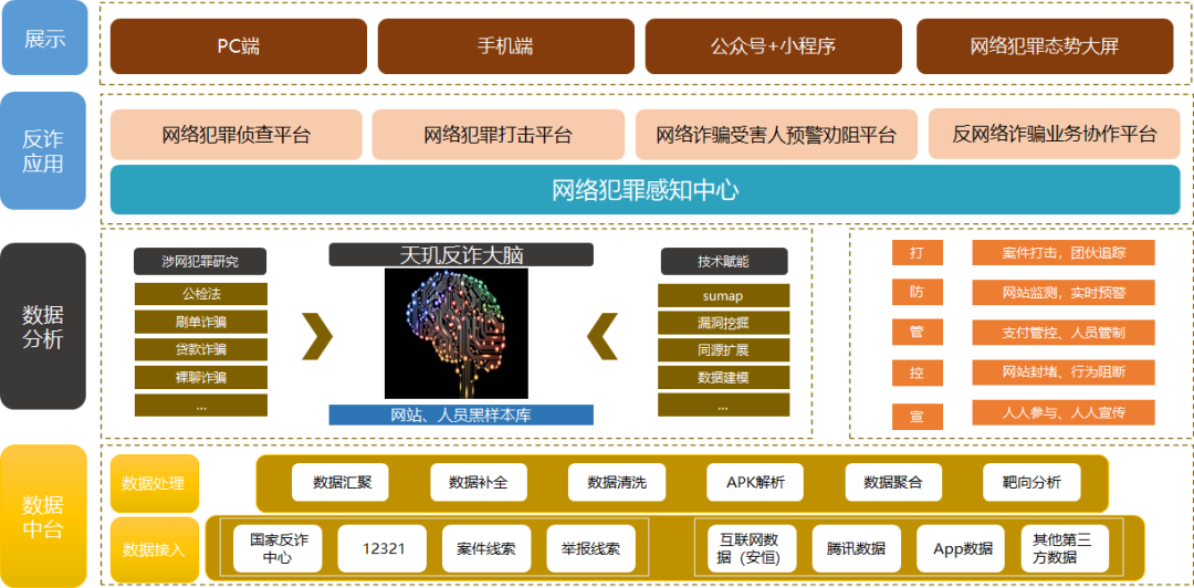 方案以網(wǎng)站封堵和潛在受害者精準識別預警為核心,構(gòu)建全民參與、警企合作、部門協(xié)調(diào)的打防管控宣一體化的反詐平臺,最終實現(xiàn)對轄區(qū)網(wǎng)絡詐騙的打、防、管、控、宣。