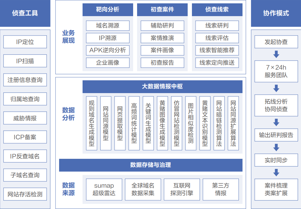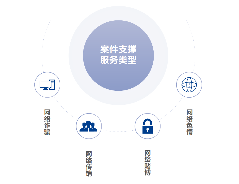 涉網(wǎng)犯罪偵查打擊支撐平臺,采用云端SaaS化服務模式,將互聯(lián)網(wǎng)情報和安服力量整合為一體,向公安機關提供工具支撐、案件線索等,實現(xiàn)對涉網(wǎng)犯罪整體案件的“專業(yè)評估、高效分析、簡單協(xié)作”。