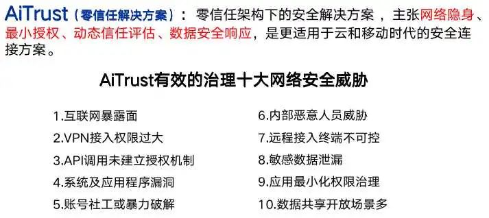 安恒信息依靠多年的技術(shù)沉淀和秉持創(chuàng)新精神,推出AiTrust零信任解決方案,該方案取代了以邊界為中心的安全架構(gòu),它可確保根據(jù)身份、設(shè)備和用戶環(huán)境動態(tài)實施安全和訪問決策。只有經(jīng)過身份驗證和授權(quán)的用戶和設(shè)備才能訪問應(yīng)用程序和數(shù)據(jù)。精準交付網(wǎng)絡(luò)隱身、最小權(quán)限、動態(tài)信任評估及數(shù)據(jù)安全保障等多項安全能力。