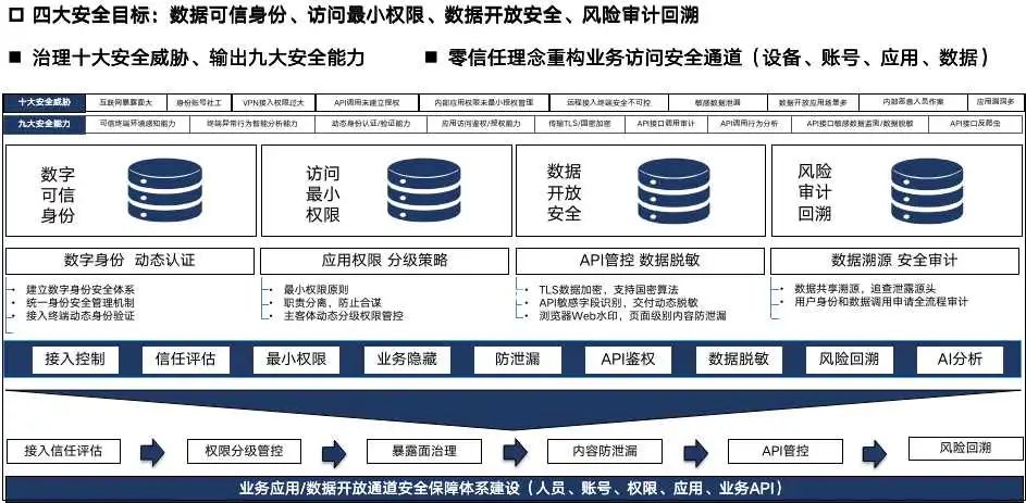 安恒信息一直致力于數(shù)據(jù)安全治理領(lǐng)域的產(chǎn)品研發(fā)和創(chuàng)新,我們自己也定義了自己的零信任能力框架。主要緯度是四個核心安全目標,數(shù)據(jù)可信身份、訪問最小權(quán)限、數(shù)據(jù)資產(chǎn)保障、數(shù)據(jù)風險回溯。打造一套業(yè)務(wù)應(yīng)用/數(shù)據(jù)開放共享通道的安全體系平臺,交付給用戶更可信的用戶身份(基于多因子和多種屬性,實現(xiàn)全面用戶身份認證)、更安全的業(yè)務(wù)訪問(采用細粒度、動態(tài)化的授權(quán)模式,安全策略策略更實時有效)、更全面的安全考量(集合環(huán)境、訪問行為、風險事件等多元素構(gòu)建訪問策略)。