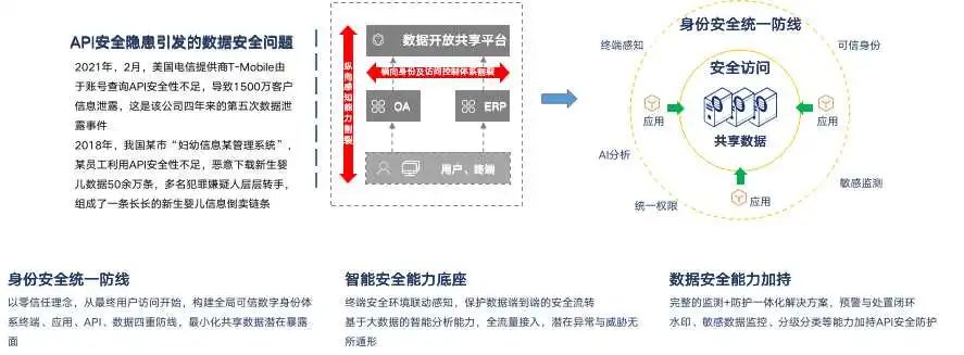 安恒信息基于零信任的理念,本次方案強調(diào)“永不信任、始終確認”,在業(yè)務(wù)訪問的全流程中引入身份認證的能力,對管控的客體對象“用戶”、“應(yīng)用”的身份進行持續(xù)校驗,并針對防護對象 API 資源,實現(xiàn)“先認證、再授權(quán)、再訪問”的管控邏輯,通過為數(shù)據(jù)安全中臺構(gòu)建虛擬身份安全邊界,最大程度上收窄公共數(shù)據(jù)平臺的暴露面,保障業(yè)務(wù)安全開展。一舉解決政企用戶多項安全頑疾:例如數(shù)據(jù)訪問無法追溯到最終用戶、API 自身脆弱性帶來的安全配置錯誤及注入風險、API 異常高頻訪問帶來的數(shù)據(jù)暴露風險等。