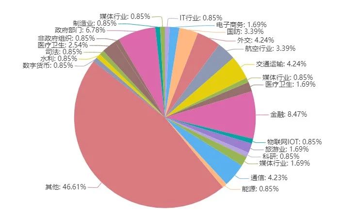 11月多數(shù)行業(yè)均遭到不同程度的惡意威脅,按照攻擊行業(yè),分布如下,其中政府部門、金融、外交、通信、交通運(yùn)輸收錄內(nèi)容占比較高。
