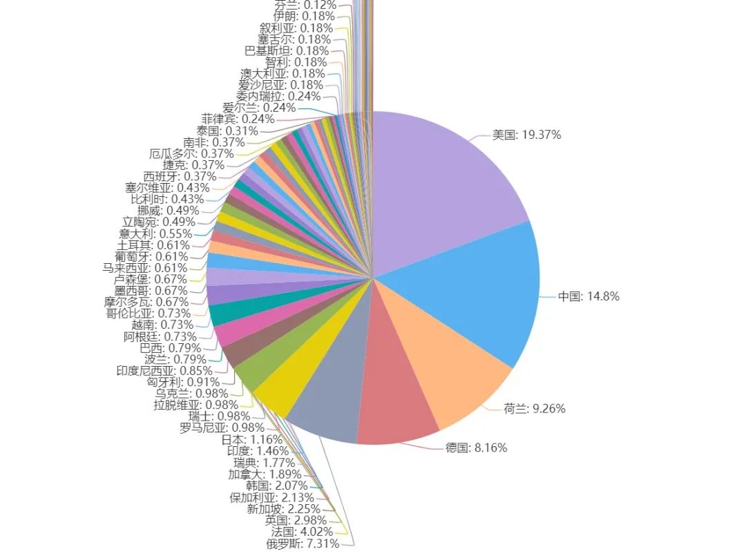 安恒威脅情報(bào)中心針對(duì)11月惡意IP情報(bào)進(jìn)行分析,整理出11月惡意IP資產(chǎn)分布地圖,其中在全球分布地圖中,惡意IP最多的前10個(gè)國(guó)家分別為美國(guó)、中國(guó)、荷蘭、德國(guó)、俄羅斯、法國(guó)、英國(guó)、新加坡、保加利亞、韓國(guó)。其中美國(guó)的惡意IP情報(bào)最高,占所有資產(chǎn)19.37%。