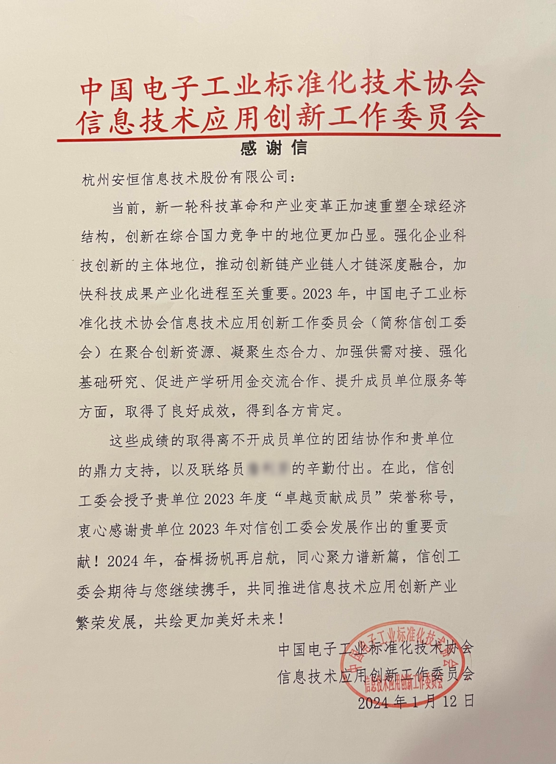 近日,中國電子工業(yè)標準化技術協(xié)會信息技術應用創(chuàng)新工作委員會(簡稱信創(chuàng)工委會)在北京召開2023年度工作總結座談會。會上,安恒信息榮獲“信創(chuàng)工委會卓越貢獻成員單位”,并收到來自信創(chuàng)工委會的感謝信。