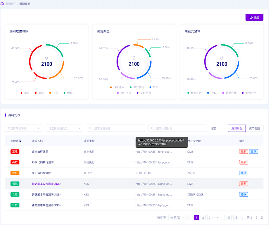 可利用漏洞驗(yàn)證評(píng)估采用漏洞利用攻擊模擬技術(shù),無損驗(yàn)證資產(chǎn)上可被利用的漏洞,漏洞POC覆蓋web應(yīng)用、操作系統(tǒng)、編程語言框架、最新熱點(diǎn)漏洞等。通過提供多個(gè)漏洞利用驗(yàn)證場(chǎng)景,基于資產(chǎn)指紋自動(dòng)適配漏洞驗(yàn)證POC,精準(zhǔn)、高效驗(yàn)證資產(chǎn)可利用漏洞,并對(duì)漏洞風(fēng)險(xiǎn)進(jìn)行多維測(cè)繪,實(shí)現(xiàn)資產(chǎn)可利用漏洞聚焦排查。