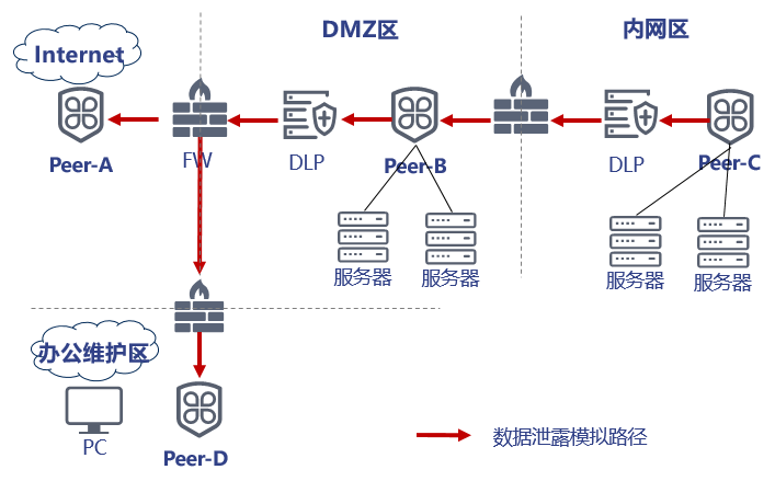 數(shù)據(jù)泄露風(fēng)險(xiǎn)評(píng)估在用戶網(wǎng)絡(luò)不同安全域之間建立評(píng)估任務(wù),采用多種數(shù)據(jù)外發(fā)方法進(jìn)行敏感數(shù)據(jù)外發(fā)測(cè)試。敏感數(shù)據(jù)類型覆蓋個(gè)人信息、源代碼、文檔文件等,通過繪制數(shù)據(jù)泄露路徑綜合分析數(shù)據(jù)泄露風(fēng)險(xiǎn),直觀展示各安全域之間的數(shù)據(jù)外泄路徑。