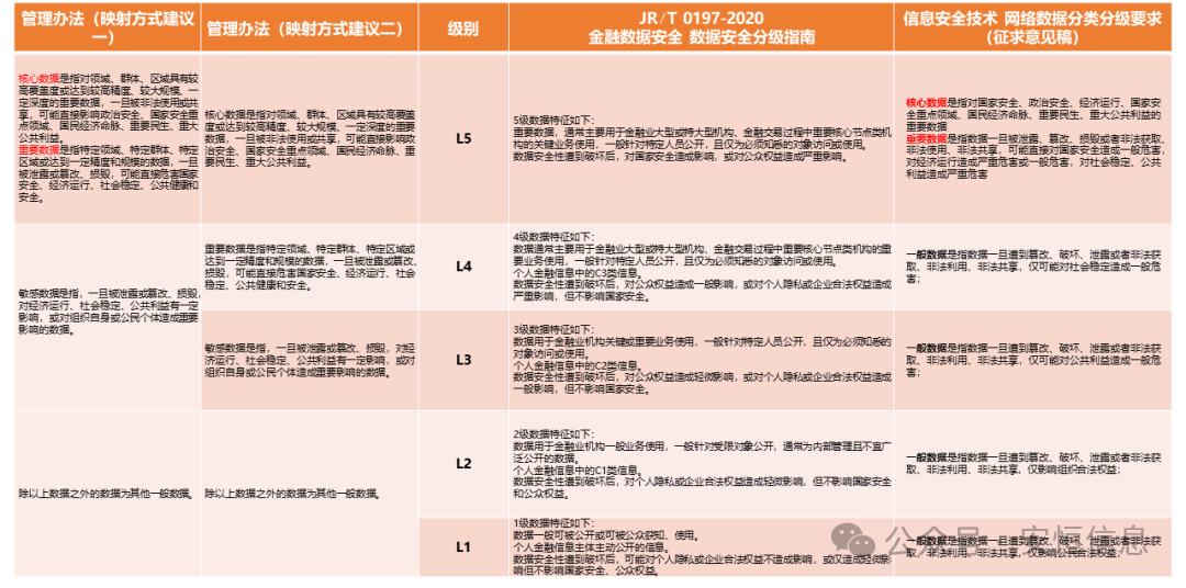 要求銀行保險(xiǎn)機(jī)構(gòu)制定數(shù)據(jù)分類分級(jí)保護(hù)制度,建立數(shù)據(jù)目錄和分類分級(jí)規(guī)范,并采取差異化的安全保護(hù)措施。將數(shù)據(jù)分為核心數(shù)據(jù)、重要數(shù)據(jù)、一般數(shù)據(jù)。其中,一般數(shù)據(jù)細(xì)分為敏感數(shù)據(jù)和其他一般數(shù)據(jù),對(duì)照之前的監(jiān)管發(fā)文要求,建議可采取以下映射思路進(jìn)行分級(jí)工作。