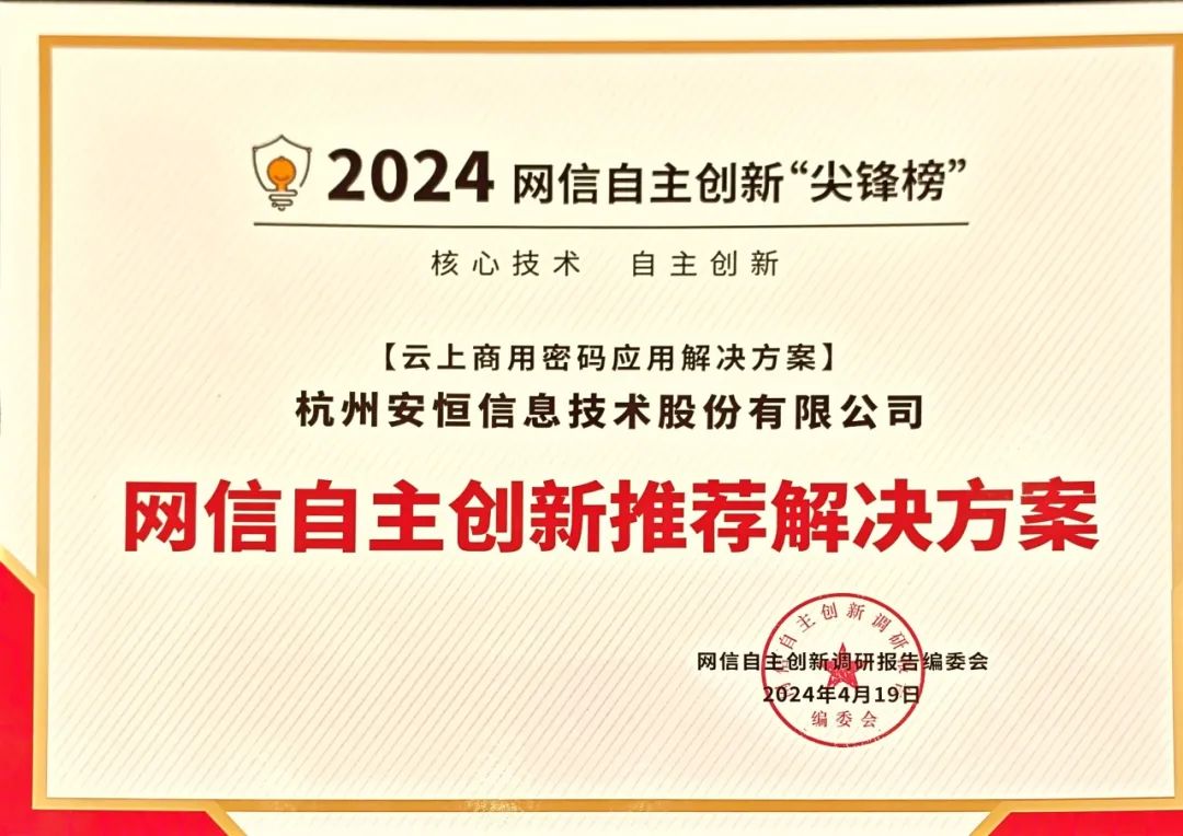 此外,在2024(第七屆)關(guān)鍵信息基礎(chǔ)設(shè)施自主安全論壇上,安恒信息攜“云上商用密碼應(yīng)用解決方案”成功入選“網(wǎng)信自主創(chuàng)新推薦解決方案”。