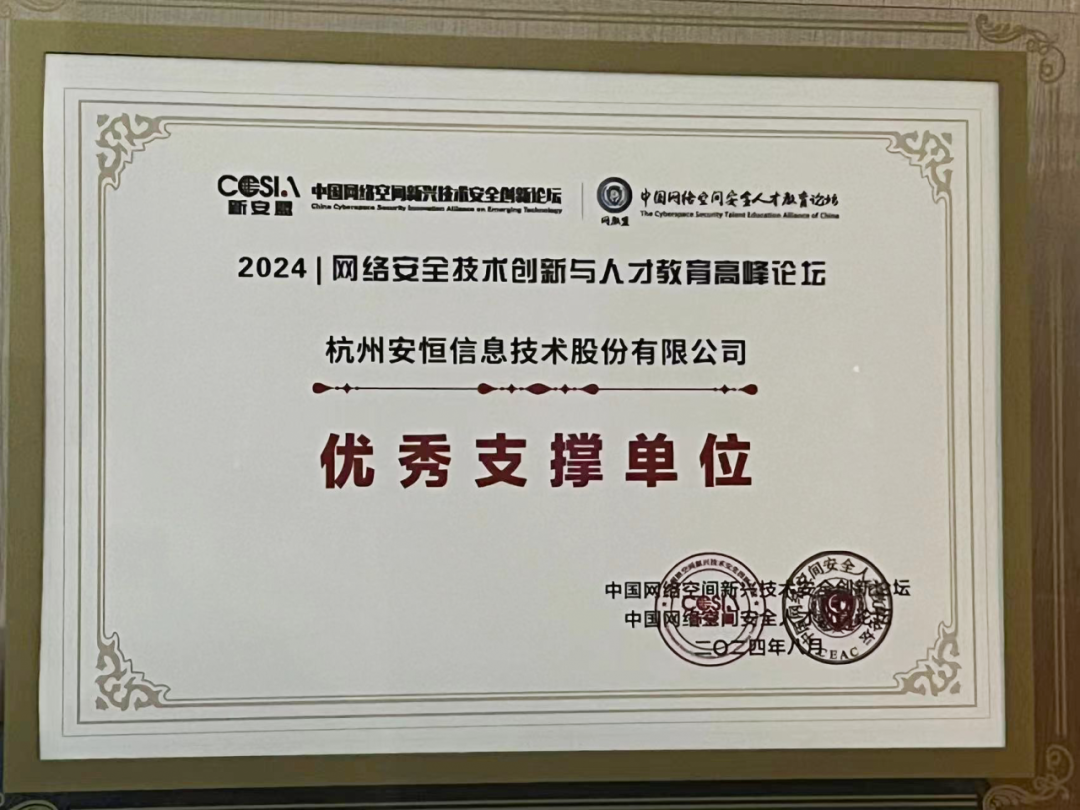 此外,安恒信息獲評2024網(wǎng)絡安全技術創(chuàng)新與人才教育高峰論壇優(yōu)秀支撐單位。