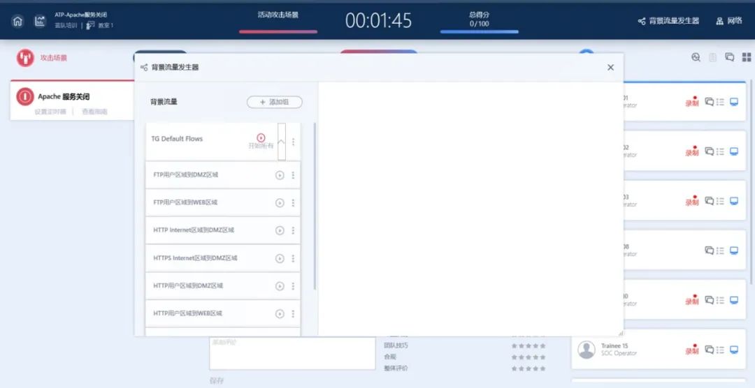 實(shí)驗(yàn)室提供背景流量生成模塊,培訓(xùn)場(chǎng)景配備常用背景流量資源,并支持講師自定義創(chuàng)建,能夠?qū)?gòu)建好的背景流量注入培訓(xùn)網(wǎng)絡(luò),以掩蓋場(chǎng)景中發(fā)生的惡意活動(dòng)。流量包括:網(wǎng)上沖浪、FTP請(qǐng)求、用戶身份驗(yàn)證及其他網(wǎng)絡(luò)(HTTP、HTTPS、FTP、POP3、SMTP和SSH等)的類型。