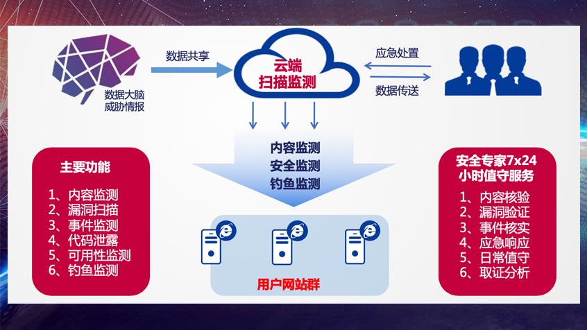 · 建有監(jiān)測云中心,監(jiān)測節(jié)點采用集群化部署,能夠支持上萬站點的網(wǎng)站安全漏洞、服務質量、安全事件的實時監(jiān)測和發(fā)現(xiàn)。
