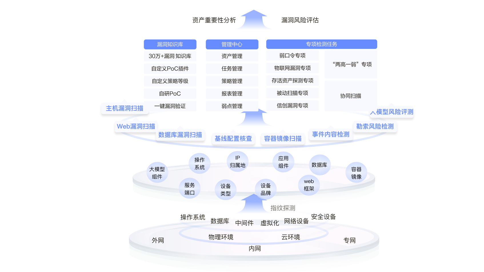 “主動(dòng)+被動(dòng)”雙引擎驅(qū)動(dòng),能夠全面覆蓋主機(jī)、網(wǎng)站、數(shù)據(jù)庫、容器鏡像等多種資產(chǎn)類型,精準(zhǔn)檢測安全漏洞、配置問題、弱口令、敏感事件等風(fēng)險(xiǎn)