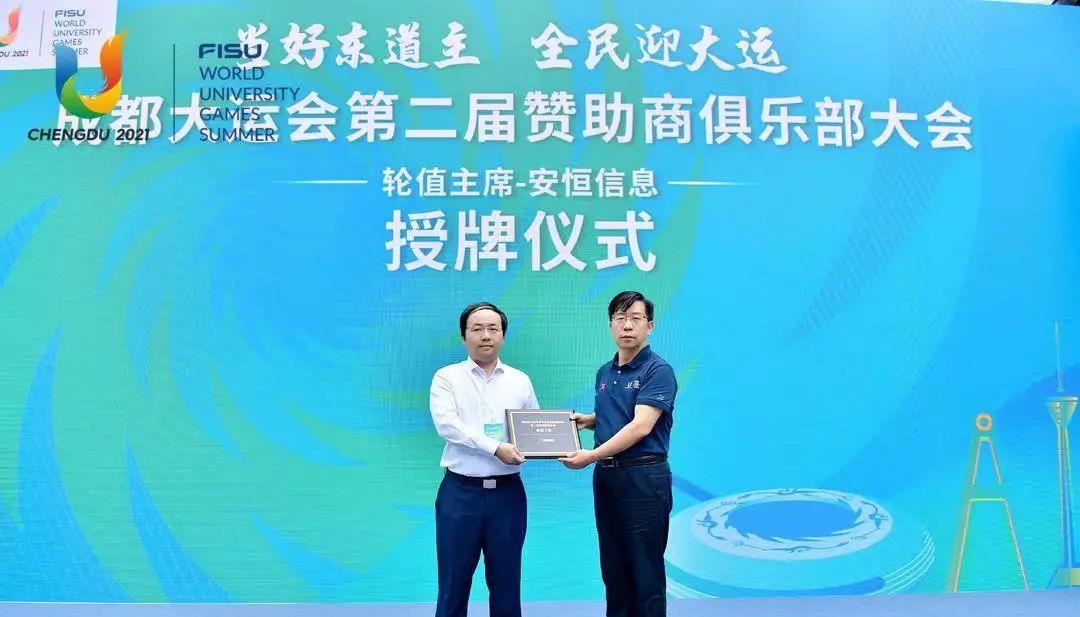 成都大運會執(zhí)委會相關(guān)負責(zé)人為安恒信息授牌,安恒信息作為贊助企業(yè)優(yōu)秀代表,正式成為第二屆贊助商俱樂部輪值主席。
