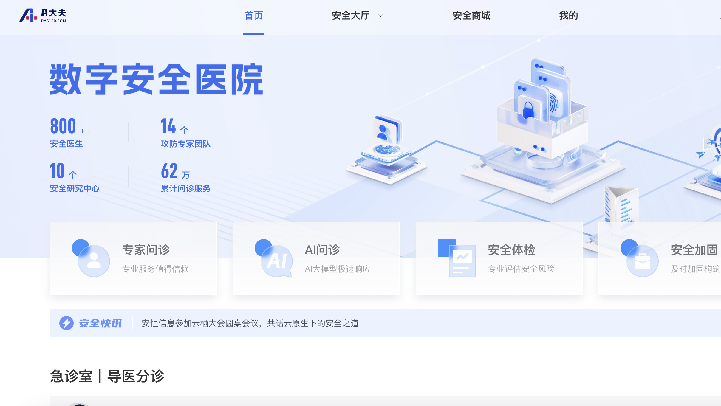 A大夫·數(shù)字安全醫(yī)院在線服務平臺 發(fā)布,切實解決中小微企業(yè)安全看病難問題。依托AI大模型,為廣大中小企業(yè)提供物美價廉的安全服務,助力企事業(yè)單位提升網(wǎng)絡安全防護能力。