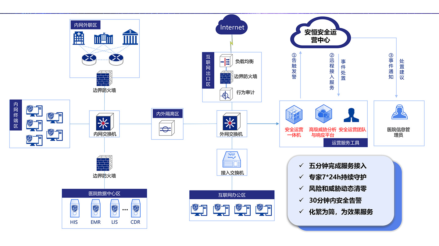 本次方案在醫(yī)院外網(wǎng)核心交換機中旁路接入安全運營一體機及高級威脅分析與響應平臺。在安全服務過程中,高級威脅分析與響應平臺將全網(wǎng)流量進行匯集,分析其中潛藏的安全威脅,同時將告警信息通過安全運營一體機發(fā)送到云端安全運營中心。當安全事件發(fā)生時,安全運營專家將遠程接入進行事件處置。