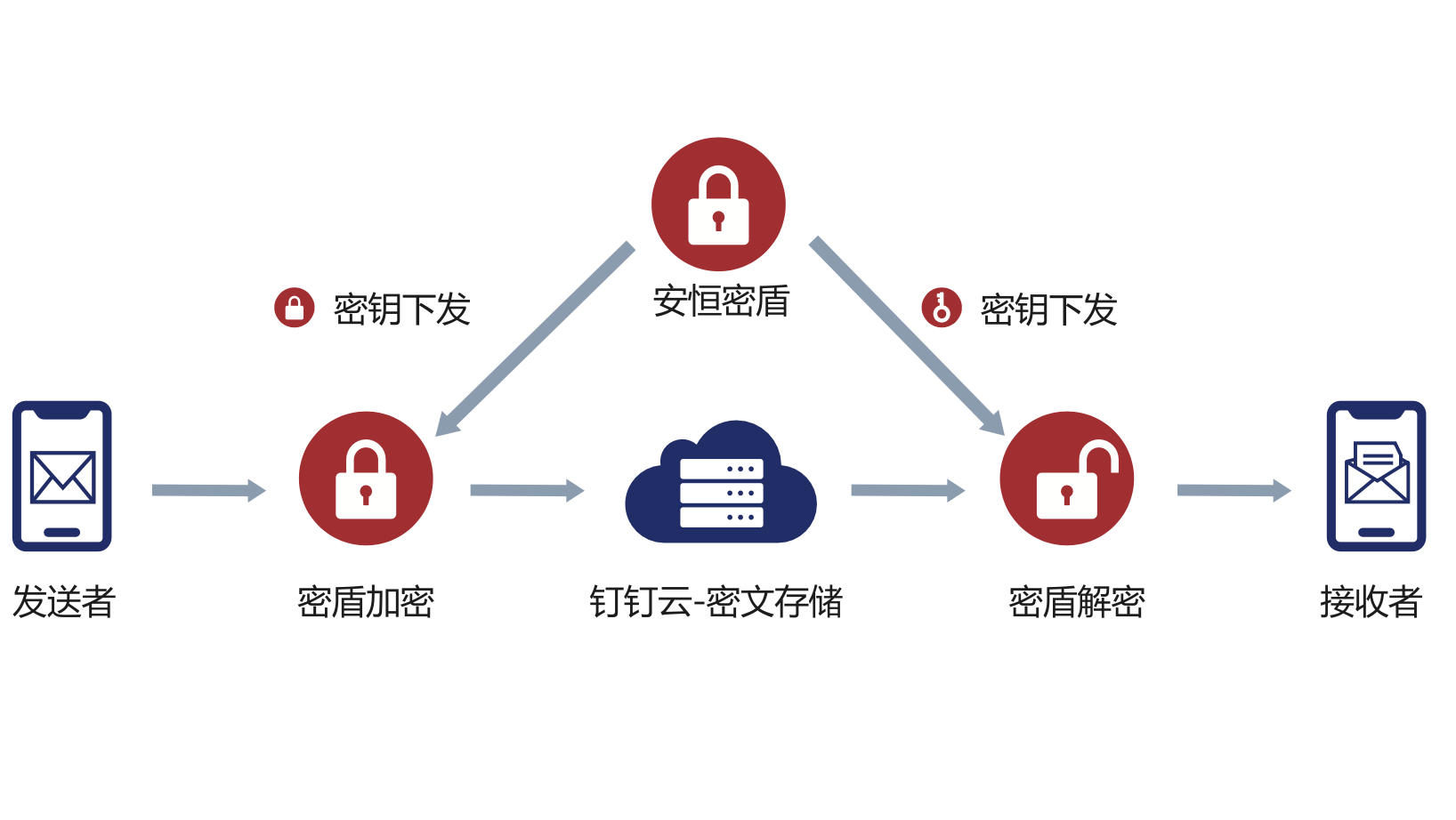 加密密鑰存儲(chǔ)在安恒密盾服務(wù)器上,密文和密鑰分離保存,任何第三方都無(wú)法解密查看聊天信息,只有企業(yè)/組織架 構(gòu)在釘釘中的合法用戶(hù)才能獲取密鑰和密文,在其終端上解密查看消息。