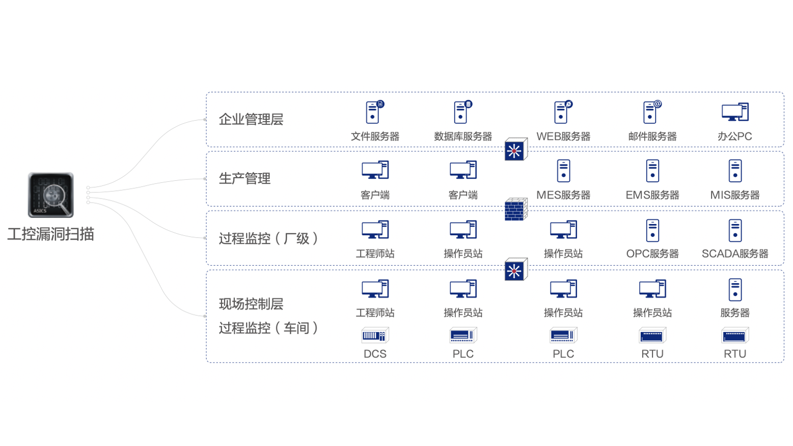 支持覆蓋西門子、GE、施耐德等20+主流工控廠商的PLC、RTU、DCS、SCADA、HMI、上位機(jī)軟 件、數(shù)據(jù)采集模塊、DTU、繼電保護(hù)裝置在內(nèi)的多種工業(yè)控制設(shè)備及系統(tǒng)的識別掃描與漏洞檢測。