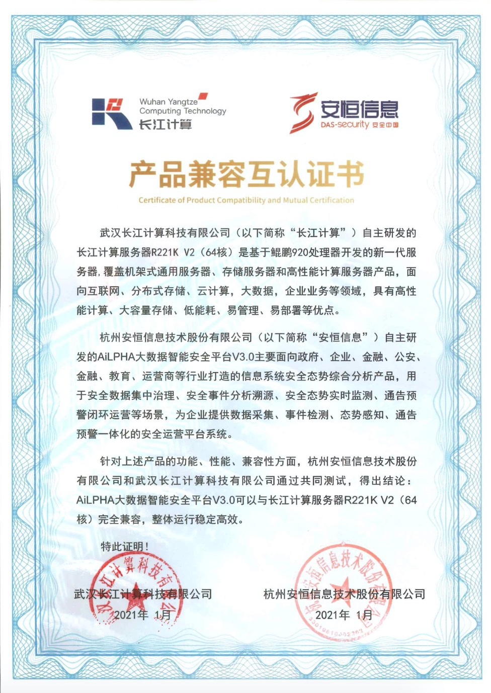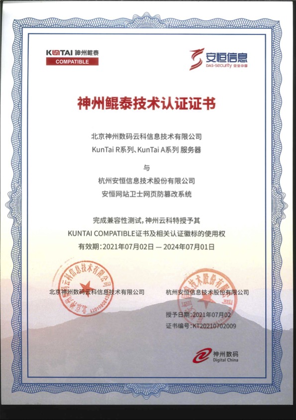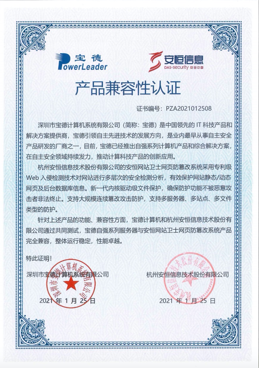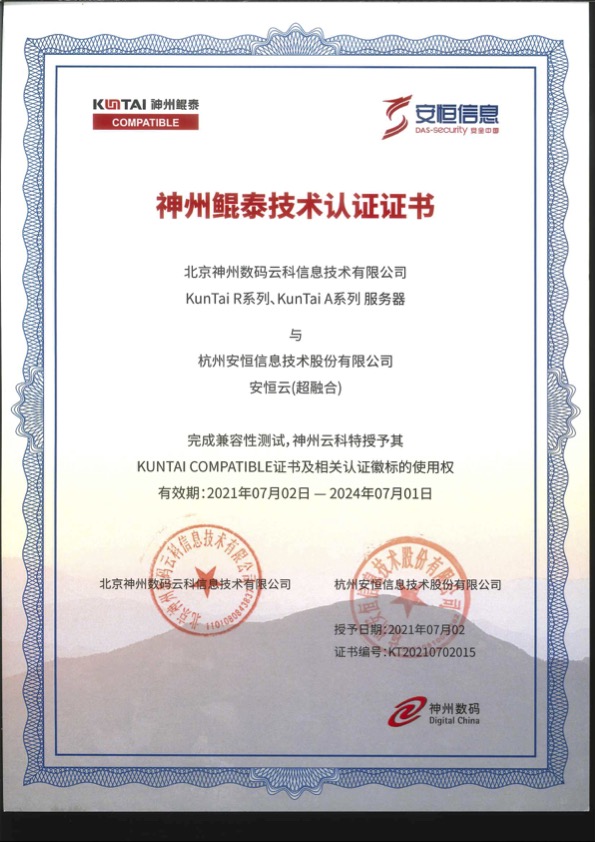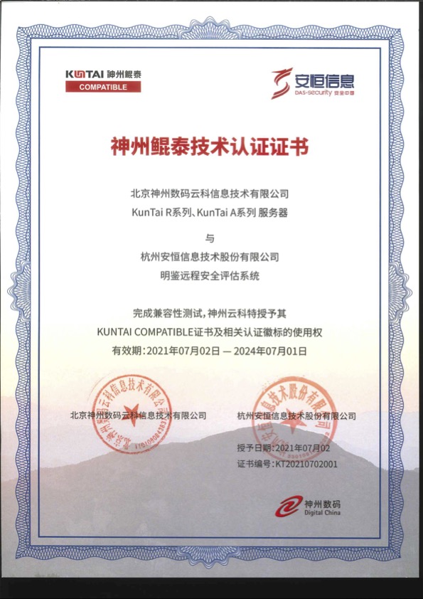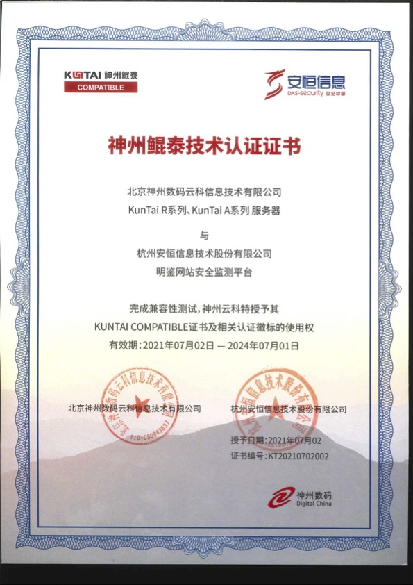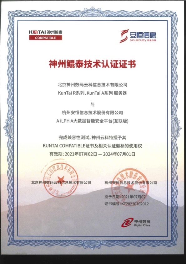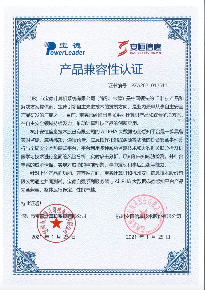 - 安恒信息AiLPHA大數(shù)據(jù)智能安全平臺(tái)、APT攻擊預(yù)警平臺(tái)分別與華為TaiShan 200系列完成兼容性測(cè)試。華為智能計(jì)算授予安恒信息HUAWEI COMPATIBLE證書(shū)及相關(guān)認(rèn)證徽標(biāo)使用權(quán)。