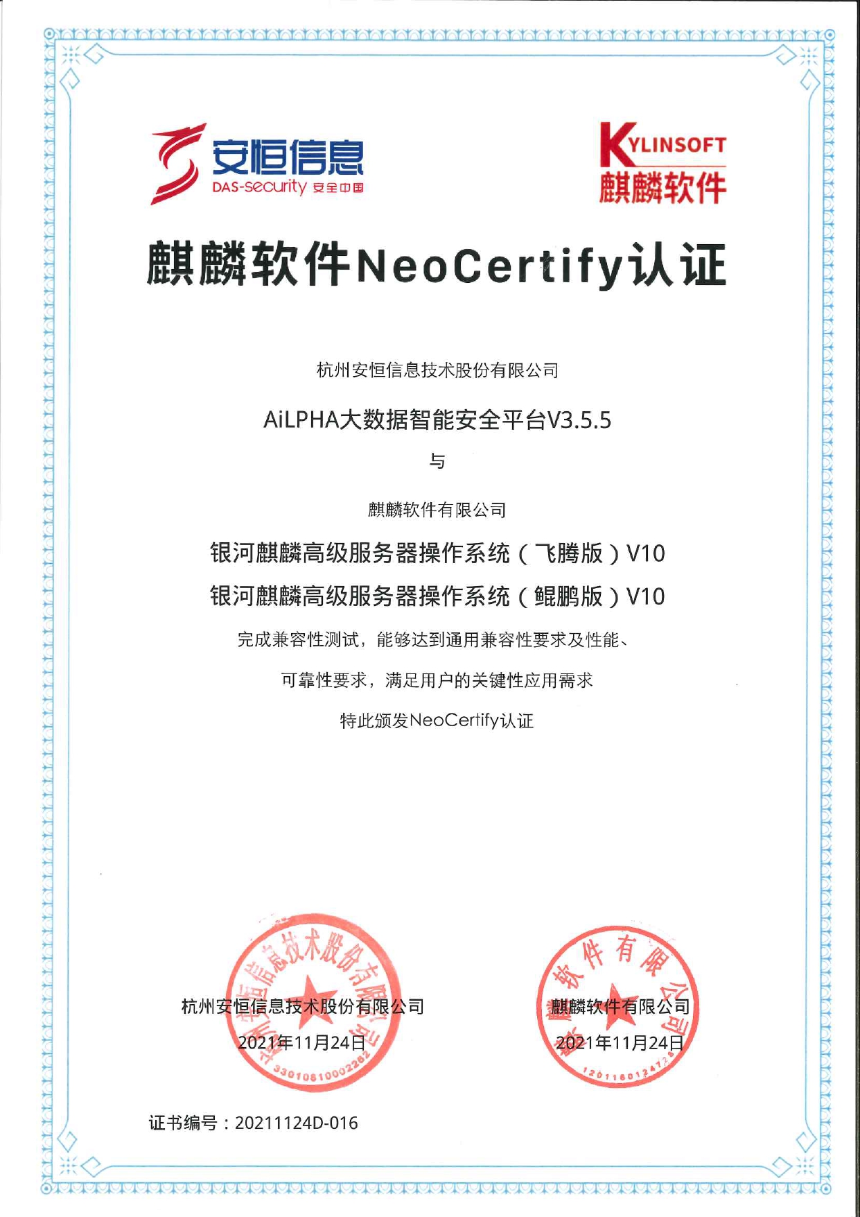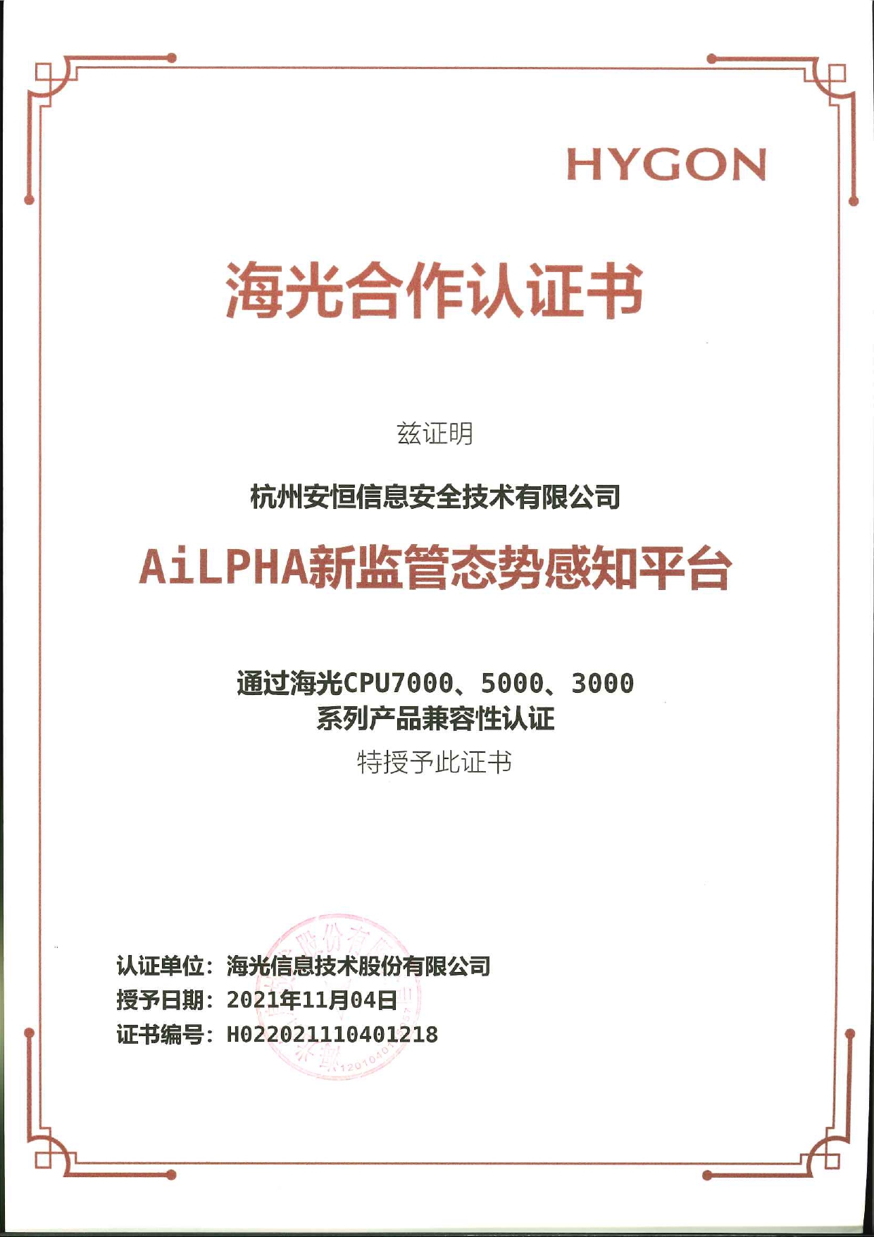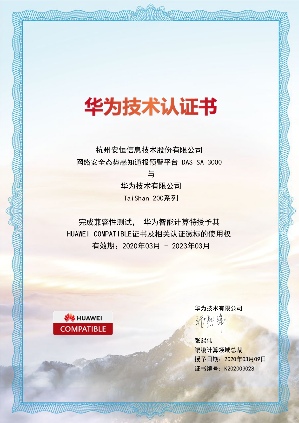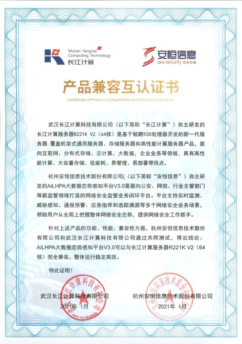 - 安恒信息AiLPHA大數(shù)據(jù)智能安全平臺(tái)、APT攻擊預(yù)警平臺(tái)分別與華為TaiShan 200系列完成兼容性測(cè)試。華為智能計(jì)算授予安恒信息HUAWEI COMPATIBLE證書(shū)及相關(guān)認(rèn)證徽標(biāo)使用權(quán)。