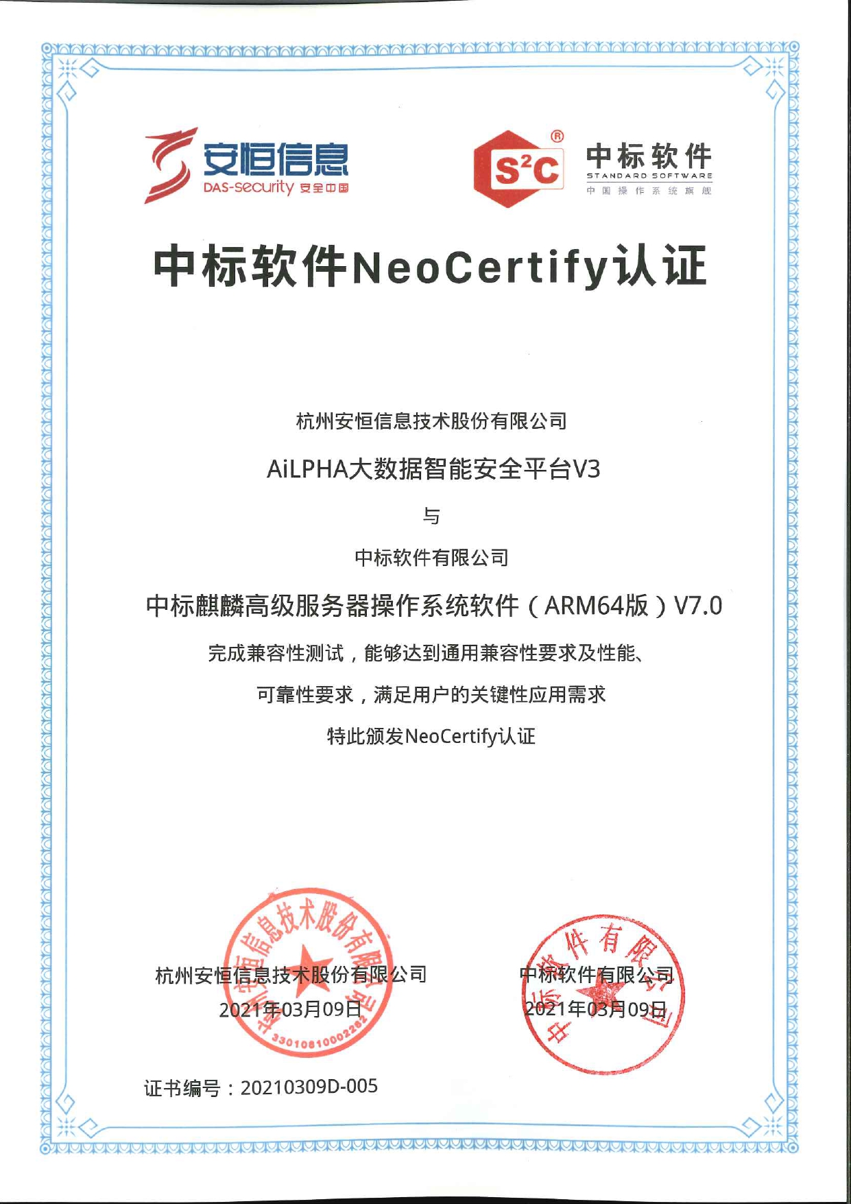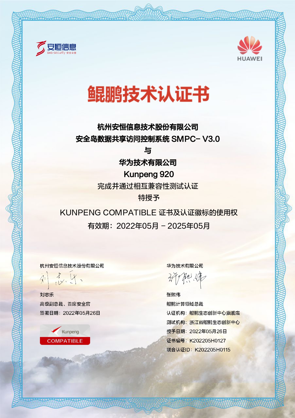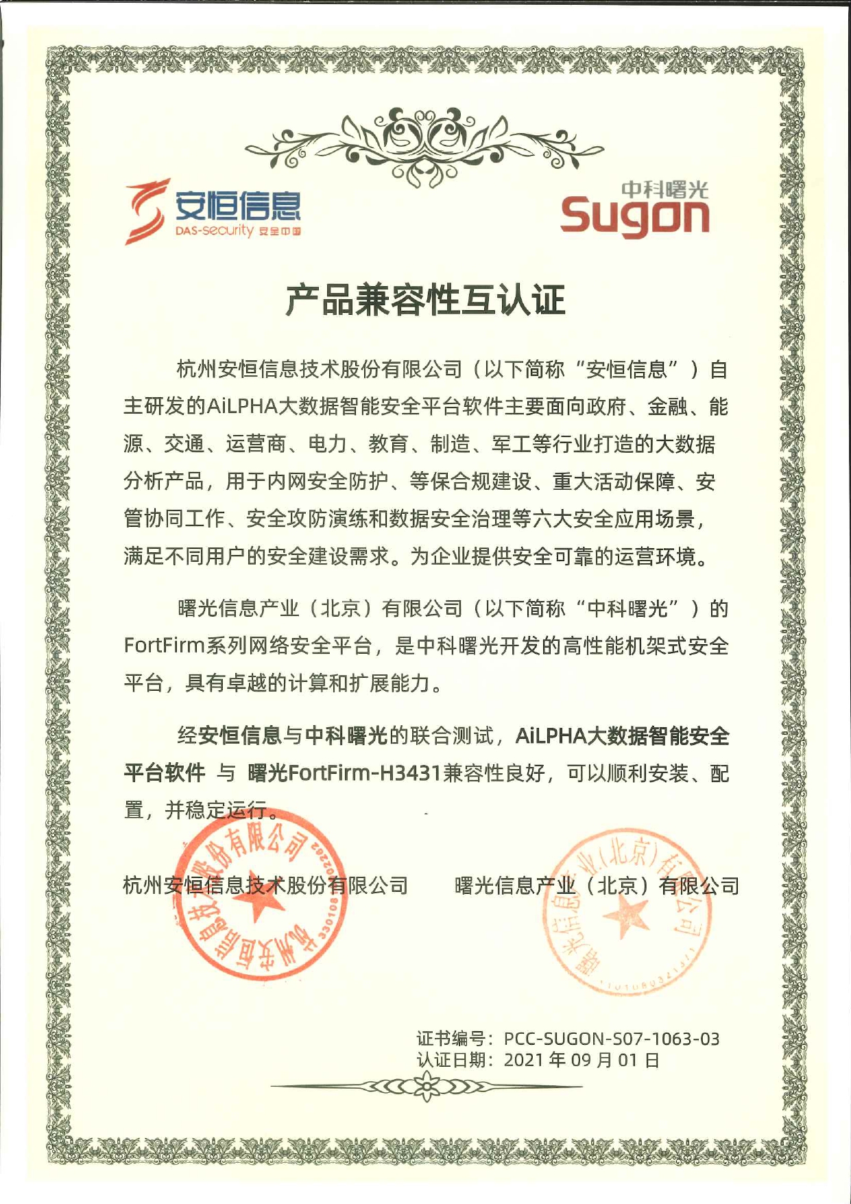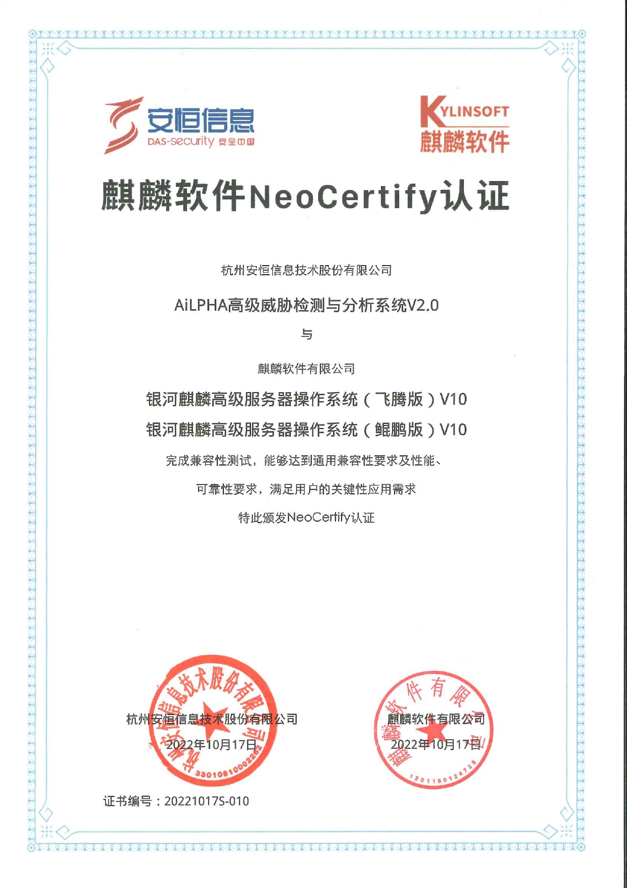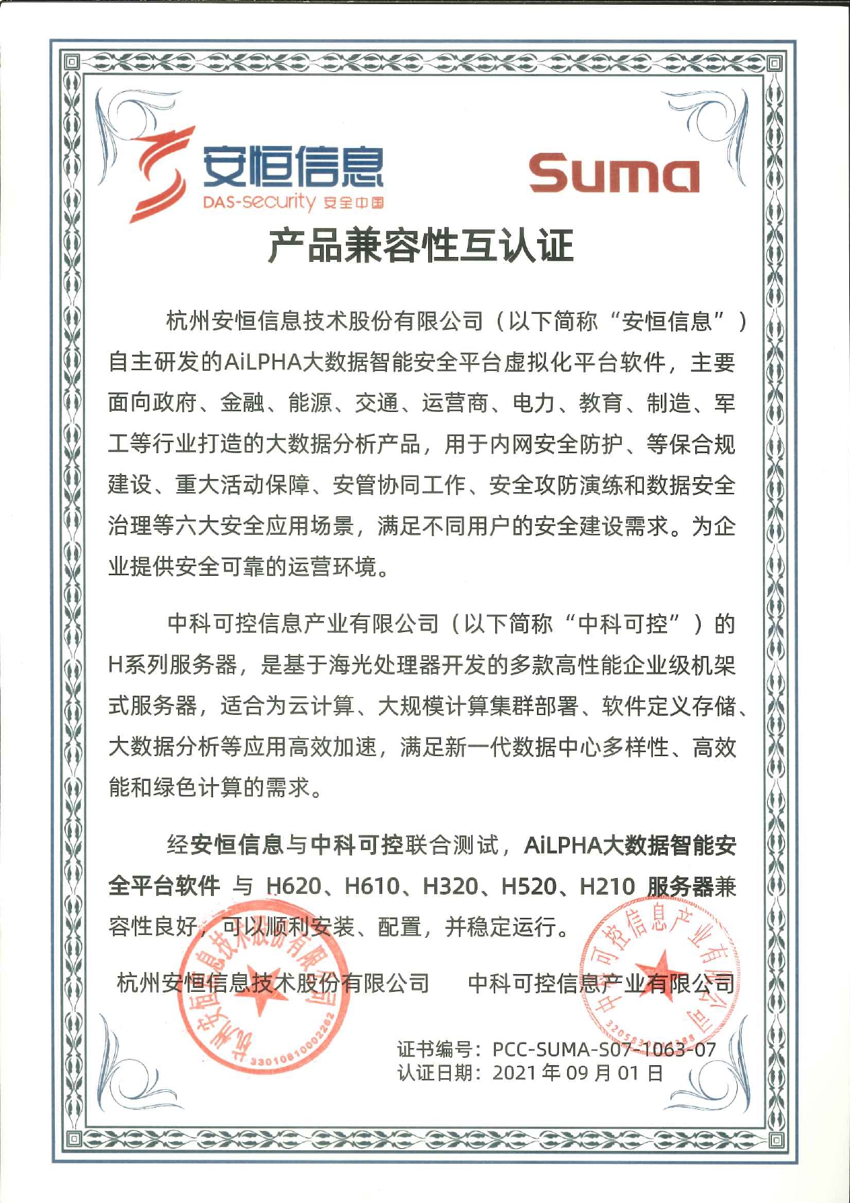 - 安恒信息AiLPHA大數(shù)據(jù)智能安全平臺(tái)、APT攻擊預(yù)警平臺(tái)分別與華為TaiShan 200系列完成兼容性測(cè)試。華為智能計(jì)算授予安恒信息HUAWEI COMPATIBLE證書(shū)及相關(guān)認(rèn)證徽標(biāo)使用權(quán)。