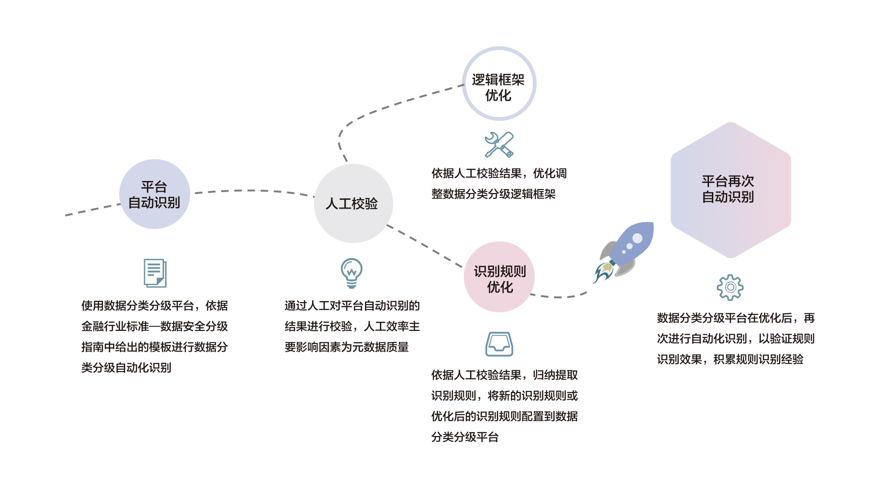工具識別完之后再進(jìn)行人工校驗,對工具的模型及識別規(guī)則進(jìn)行策略調(diào)優(yōu),然后再以新的規(guī)則進(jìn)行自動化識別,不斷提高分類分級打標(biāo)的效率,為后續(xù)精細(xì)化數(shù)據(jù)安全防護(hù)提供精確的分類分級結(jié)果。